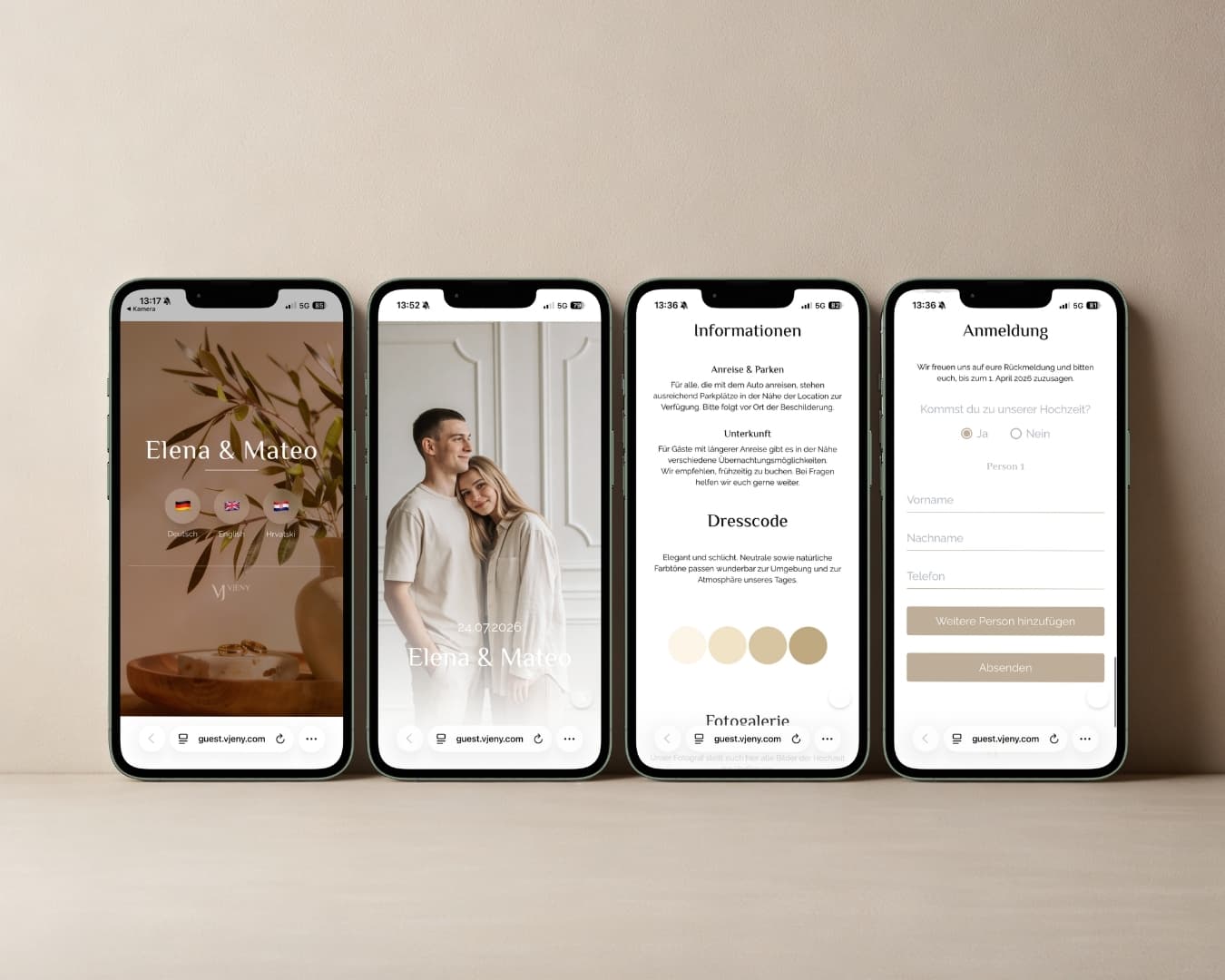 Entdeckt stilvolle Designs für eure Hochzeitswebsite und findet den Stil, der perfekt zu euch und eurer Hochzeit passt. Mit VJENY erstellt ihr in wenigen Minuten eure persönliche Hochzeitswebsite – modern, übersichtlich und speziell für Smartphones optimiert. Eure Gäste greifen ganz einfach über den QR-Code auf alle wichtigen Informationen zu und geben ihre Rückmeldung direkt online ab. Wählt aus verschiedenen Designvorlagen und passt Inhalte wie Bilder, Texte und Abläufe individuell an. So entsteht eine Hochzeitswebsite, die nicht nur gut aussieht, sondern auch eure gesamte Planung vereinfacht.
